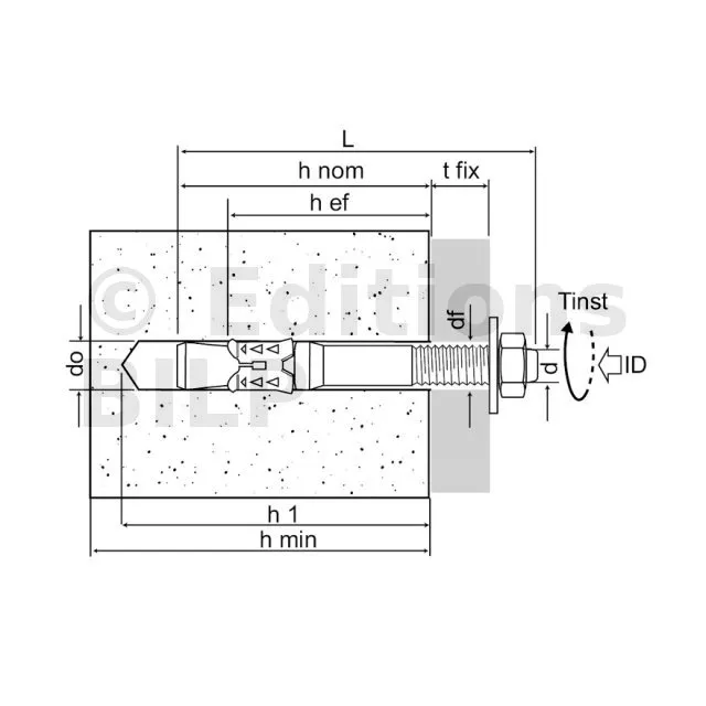 | Références | Référence produit | Dimensions [ØxL] [mm] | Ø perçage [d0] [mm] | Prof. min. de perçage [h1] [mm] | Ø perçage dans pièce à fixer (au travers) [df] [mm] | Ouverture de clé sur plat [SW] [mm] | Couple de serrage [Tinst] [Nm] | Prof. ancrage [hef] [mm] | Ep. mini du support [hmin] [mm] |