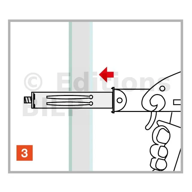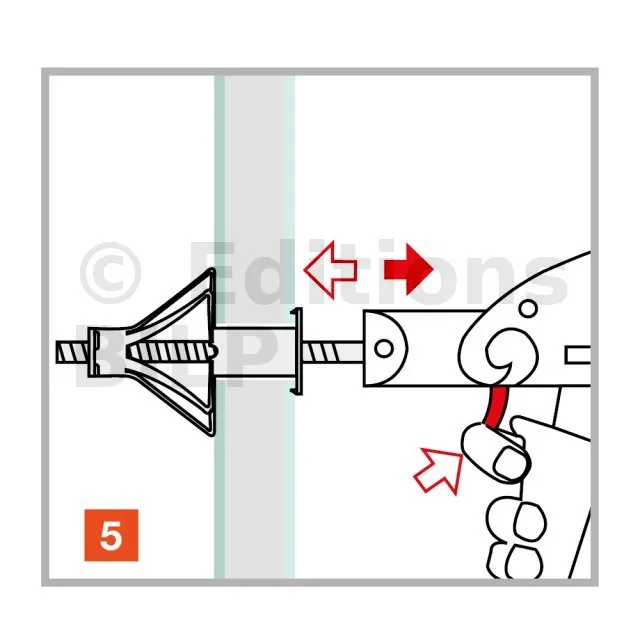 La cheville est disposée dans le perçage sur le support avec une pince dédiée, l’action de la pince permet l’expansion et le verouillage de la cheville contre le support.