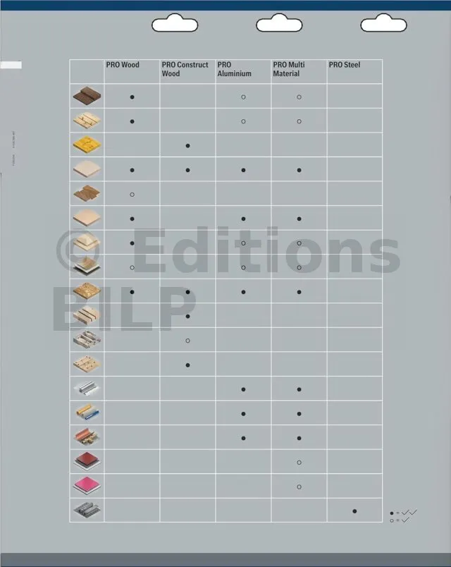 Pour la colonne PRO Multi-Matériaux, les matériaux compatibles avec la lame sont ceux mentionnés dans le chapitre Caractéristiques. Les matériaux pouvant être découpés mais de manière moins optimale sont le bois dur, le bois résineux, les panneaux plastifiés et le HPL stratifié haute pression.