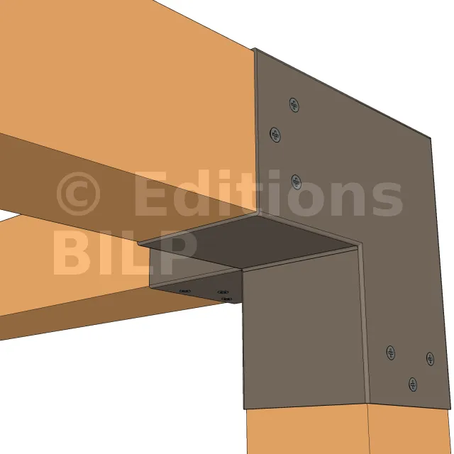Il est utilisé dans un angle extérieur. Ce connecteur va permettre de raccorder une poutre 90x90mm perpendiculairement à une poutre 90x90mm, le tout étant supporté par un poteau vertical 90x90mm.