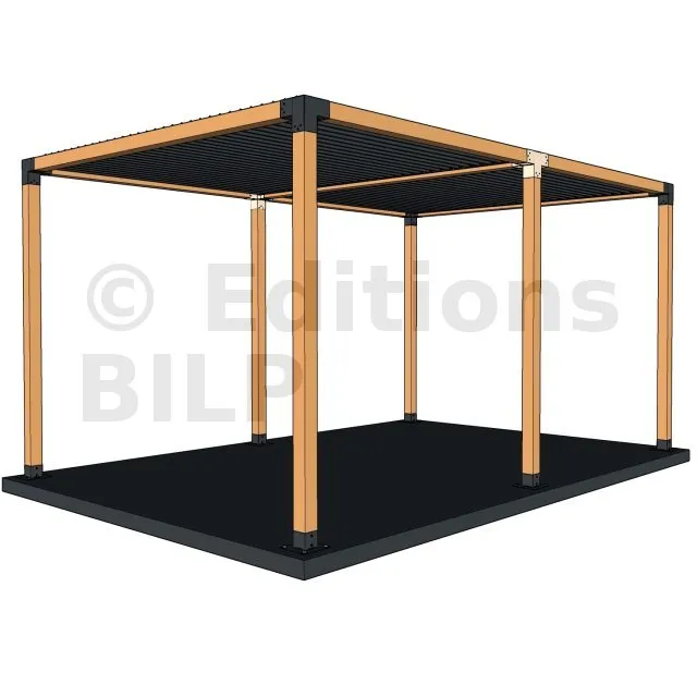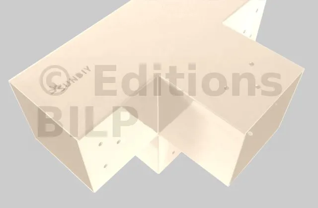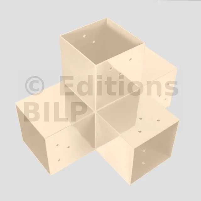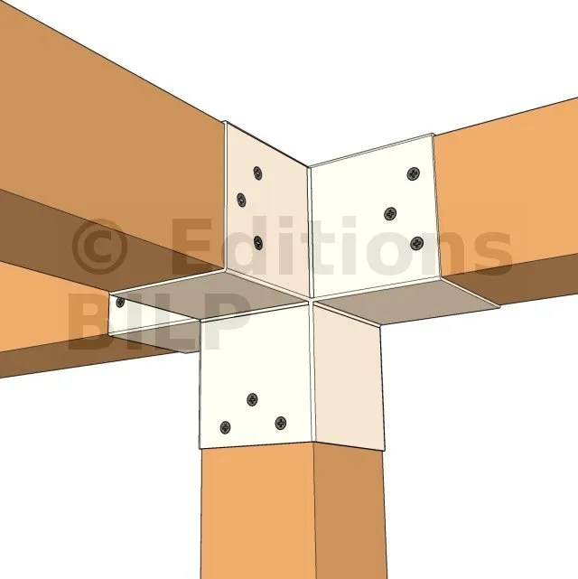 Il permet de raccorder une poutre de 90x90mm perpendiculairement à un chevron de 90x90mm, le tout étant supporté par un poteau vertical de 90x90mm.