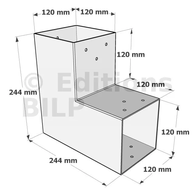 Il est utilisé dans un angle extérieur. Ce connecteur va permettre de raccorder une grosse poutre 120x120mm perpendiculairement à une autre poutre ou à un poteau vertical 120x120mm.