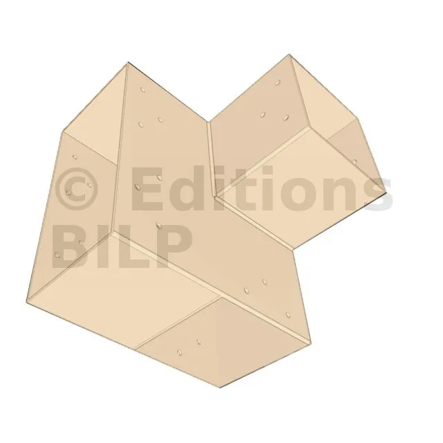 Il est utilisé dans un angle extérieur. Ce connecteur va permettre de raccorder une grosse poutre 240x120mm perpendiculairement à une poutre 120x120mm, le tout étant supporté par un poteau vertical 120x120mm.