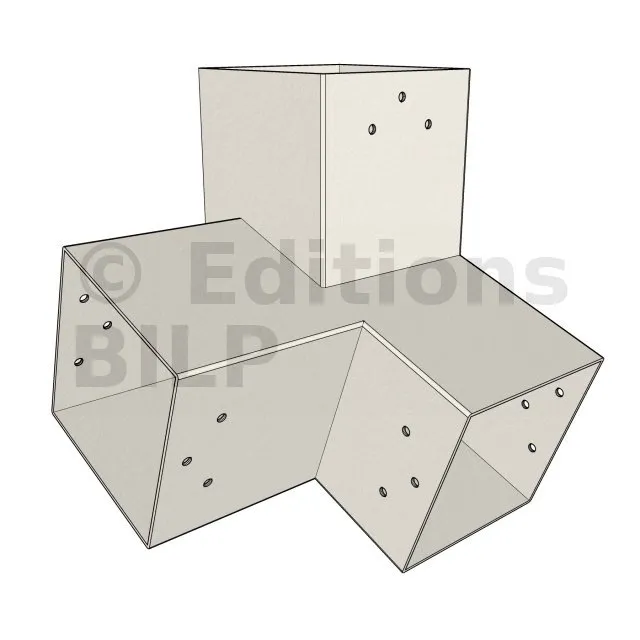Il est utilisé dans un angle extérieur. Ce connecteur va permettre de raccorder une poutre 120x120mm à une poutre 120x120mm avec une pente de 20°, le tout étant supporté par un poteau vertical 120x120mm.