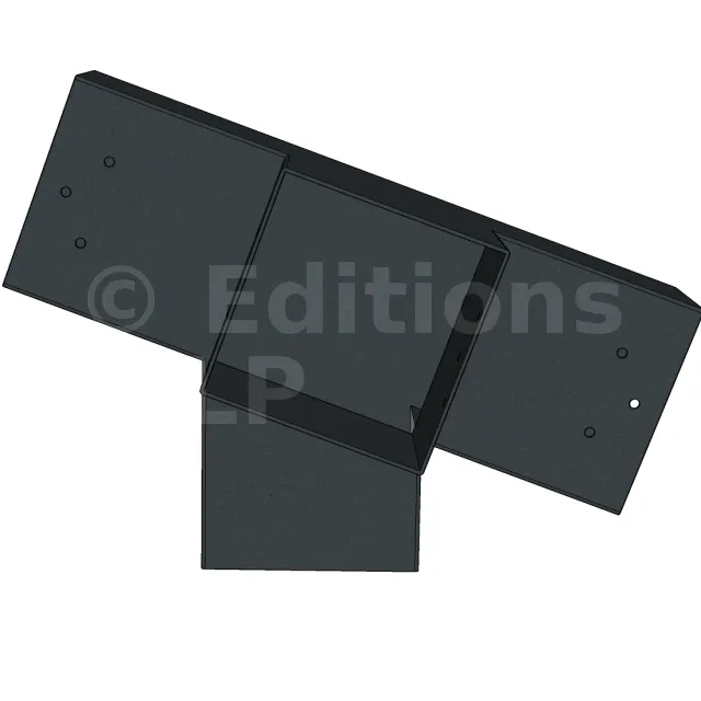 Connecteur d’angle intérieur à quatre directions, conçu pour l’assemblage de deux poutres en section 120x120 mm formant un angle de 20° avec un poteau vertical de même section. Il assure une liaison structurelle rigide et orthogonale à mi-hauteur, garantissant la stabilité de l’ensemble.