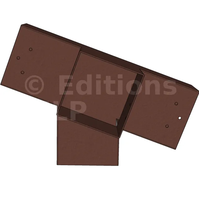 Connecteur d’angle intérieur à quatre directions, conçu pour l’assemblage de deux poutres en section 120x120 mm formant un angle de 20° avec un poteau vertical de même section. Il assure une liaison structurelle rigide et orthogonale à mi-hauteur, garantissant la stabilité de l’ensemble.