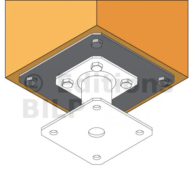 1. Monter la platine sur le poteau à l’aide de 4 tirefonds LAG Ø10x80 dans les perçages extérieurs.