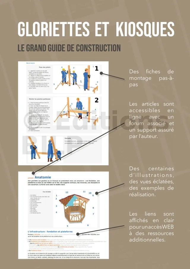 Du bricoleur débutant au poseur pro, réussissez votre gloriette à coup-sûr. Offrez-vous le nec-plus-ultra des guides de construction, le guide COMPLET et son accès Membre exclusif.