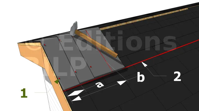 Travaillez le long de la crête vers la direction des vents dominants, de sorte à ce que les chevauchements puissent affronter le vent et la pluie battante. Dans le cas où vous utilisez une faîtière de type 30 cm ; posez les faîtières le long de la crête suivant la ligne de référence tracée de part et d’autre du sommet. La première faîtière doit embrasser la bordure de la bande de rive. Bien clouer la première faîtière. Superposer la prochaine faîtière à 13 cm de la première et clouer-les ensembles par la suite. Suivez les mêmes instructions pour poser les autres faîtières tout en les alignant le long de la ligne de référence.