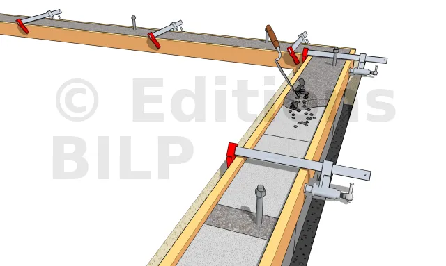 Si le montage du mur est parfait, vous n’aurez pas besoin d’arase. Mais pour remettre tout à niveau, l’arase est réalisée avec un coffrage que l’on rempli de mortier. Les planches sont maintenues avec des serre-joints et ajustées au niveau désiré.