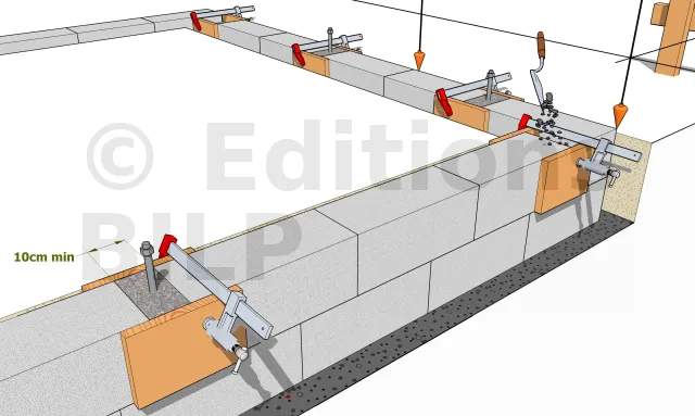 Il faut prévoir l’emplacement des fixations (équerres pour une plateforme, tiges filetées pour une lisse basse). Car il est impossible de fixer efficacement par le dessus d’un parpaing creux. Il faut du plein. Dans le cas d’une tige filetée, vous remplissez avec un mortier relativement "sec" qui autorise un scellage immédiat de la tige. Un plan de disposition des fixations est nécessaire pour ne rien oublier et pour ne pas tomber sur un montant vertical (mur sans plateforme).
