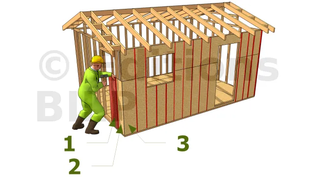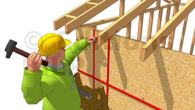 Une deuxième rangée de panneaux doit être installée pour couvrir le reste jusqu’au sommet, juste en dessous du larmier. Fixer-la avec des clous et laisser de petits écarts d’extension entre les bords des panneaux. Certains panneaux ont des bords rainurées. Sinon, couvrir les joints avec des lattes.