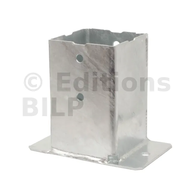 | Pied de poteau carré à boulonner PPJBT100 | Largeur 102 mm ; platine 200 × 200 mm pour meilleure stabilité des poteaux porteurs ; acier DD11 + galvanisation ; 4 perçages Ø12 mm et hauteur 150 mm. |