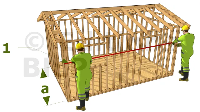 Pour commencer, il est important de tracer une ligne de niveau afin de pouvoir fixer convenablement les panneaux. Pour ce faire, il suffit de placer une corde à 1,20 m de hauteur, de part et d’autre des coins de notre cabane. L’utilisation d’un cordeau à poudre permet de tracer rapidement.