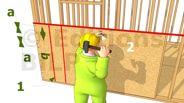 Pour la fixation, placer chaque panneau de manière à ce que les bords soient centrés sur les poteaux. Clouez les panneaux avec des clous D6 tous les 15 cm sur le bord. Tracer des lignes médianes sur les poteaux intermédiaires, et clouez le long de ces lignes à une intervalle de 30 cm. Bien suivre la ligne de craie tracée.