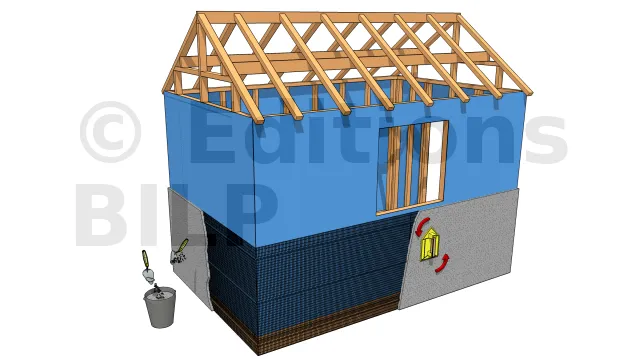 A l’aide d’une truelle, couvrir la surface du mur de la zone d’installation avec une couche de mortier d’une épaisseur d’environ 1-3 cm. Pour cela, préparer un mélange de deux sables avec un mortier de type N et assez d’eau jusqu’à ce que le mélange soit bien consistant. Après avoir appliqué le mélange avec la truelle sur le mur et 30 minutes de séchage, lissez et aplanissez la surface à l’aide d’une taloche.