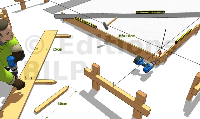 Mise en place du coffrage Fixez des tasseaux taillés en pointe à des planches de coffrages. Le tasseau doit affleurer le bord supérieur de la planche afin de ne pas gêner les passages de l’outil de lissage du béton ultérieurement. Plantez votre planche en veillant à ce que le bord intérieur soit aligné sur le fil-repère. Assembler les planches aux angles. Vérifiez également les niveaux supérieurs des planches de coffrage car cela conditionne directement la planéité et l’horizontalité de la dalle. Revêtement lubrifiant | Vissage facile, Résistance moindre au vissage | Nécessite moins d’énergie et de force |