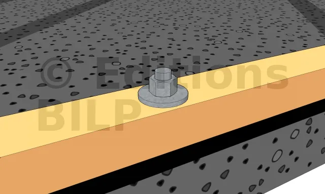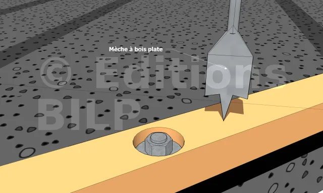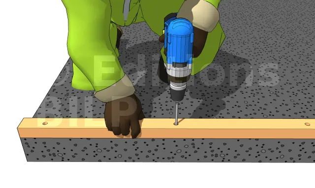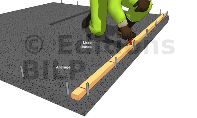 La lisse va nous servir de guide de perçage. Elle doit donc être percée au préalable. Positionnez-la à sa position finale. Percez la dalle en béton en passant la mèche au travers des orifices existants. Le diamètre de la mèche béton correspond à celui de la tige filetée + 2 mm au maximum. Ex : pour une tige filetée D14, percer à D16.