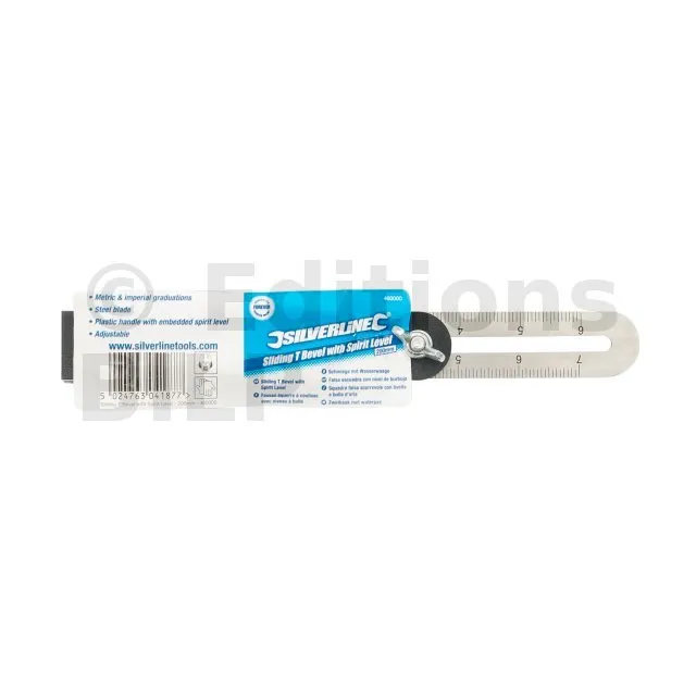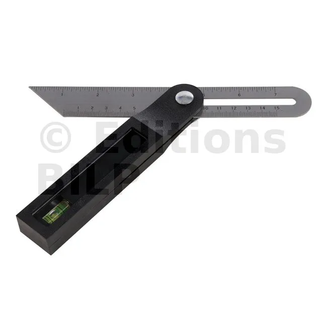 Angle réglable, lame en acier à graduations métriques et impériales, poignée en plastique avec niveau à bulle incorporé et vis de fixation.