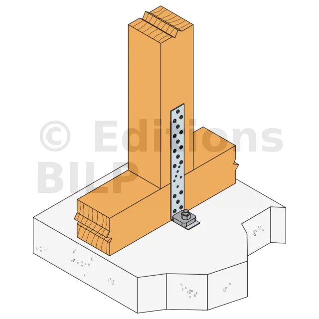- Ancrage chimique : résine AT-HP + tige filetée LMAS M12 avec un tfix supérieur à l’épaisseur de bois à traverser + 12 mm.