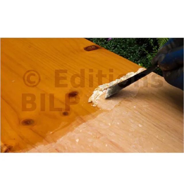 - Enlever la pâte obtenue avec une spatule ou une brosse à chiendent en nylon (selon dureté du bois). Sur bois fragile ou sur support intérieur pour un aspect soigné, préférer une brosse en laiton doux. Rincer le DSP 800 à l’aide d’une éponge humide imbibée d’eau tiède (attention à ne pas relever la fibre du bois, si besoin égrener avec du papier abrasif de grain moyen à fin).