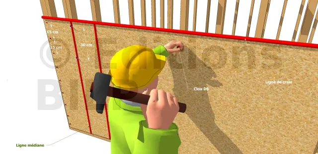 Pour la fixation, placer chaque panneau de manière à ce que les bords soient centrés sur les poteaux. Clouez les panneaux avec des clous D6 tous les 15 cm sur le bord. Tracer des lignes médianes sur les poteaux intermédiaires, et clouez le long de ces lignes à une intervalle de 30 cm. Bien suivre la ligne de craie tracée.