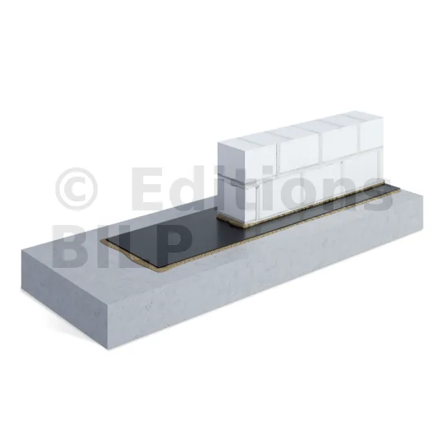 Ouvrages en maçonnerie (DTU 20.1) : La bande d’arase DELTA®-DPC est positionnée entre deux couches de mortier de ciment, à une hauteur minimale de 15 cm au-dessus du sol extérieur.