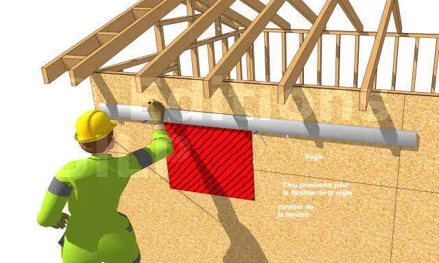 Pour faire le marquage, fixer des pointes traversantes aux quatre coins du cadre de fenêtre de la structure, à l’intérieur, puis tracer une ligne de craie à l’extérieur pour marquer le contour de la fenêtre.