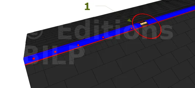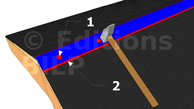 Tout en continuant à fixer les pièces d’évent, laissez une section de ventilation entre les pièces et poursuivre la fixation sur toute la longueur du toit y compris les zones d’extrémités sur lesquels les bardeaux ne sont pas encore découpés.