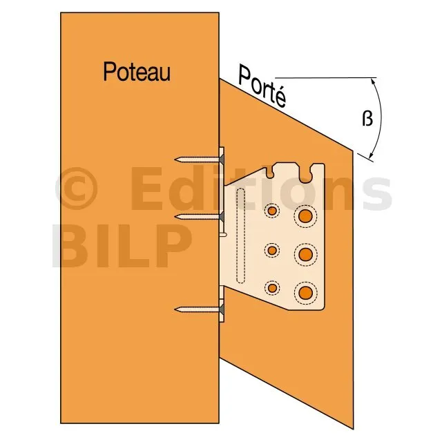 - Fixation solive sur poteau - clouage total - avec pente et angle α=45°Porteur : 5XCNA4,0x50 - Porté : 4XSTD8