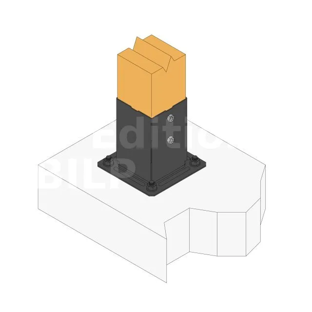 Installation Partie basse : 1. Positionner le pied de poteau dans la structure. 2. Identifier la position des ancrages au sol sur le support. 3. Percer le support verticalement au diamètre et à la profondeur préconisés pour les fixations choisies. 4. Fixer la platine au sol à l’aide des chevilles d’ancrages sélectionnées