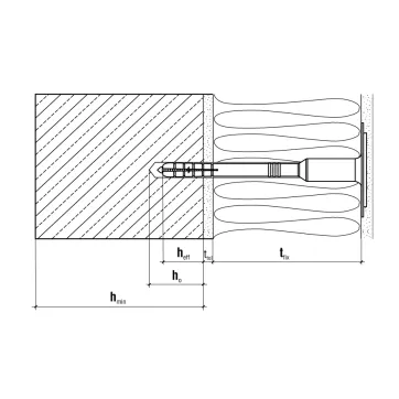 Longueur minimale de la cheville Ld = tfix + ttol + heff avec tfix : épaisseur maximale des pièces à fixer, ttol : épaisseur des sous-couches (adhésif + enduit existant), heff : profondeur d’ancrage.