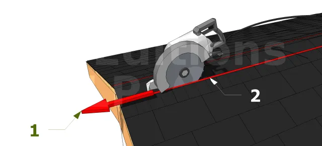 En utilisant une scie circulaire, découpez les parties à enlever suivant la ligne de craie. Assurez vous de ne pas couper les chevrons et arrêtez de couper à 15 cm des pignons. Faites deux coupes transversales pour rejoindre les deux coupures sur les extrémités. Enlevez les bardeaux dans la zone de découpe. Renforcer les clous des bardeaux à proximité des bords de coupes pour les fixer aux chevrons.