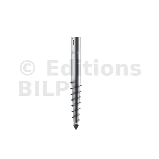 - à l’une des extrémités une pointe “harpon” surmontée d’une partie en spirale pour pouvoir creuser le sol,