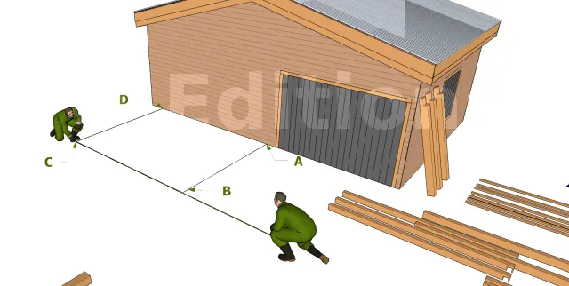 Repérer les quatres coins de positionnement des poteaux. Les segments AC et DB doivent être égaux pour avoir un rectangle droit.