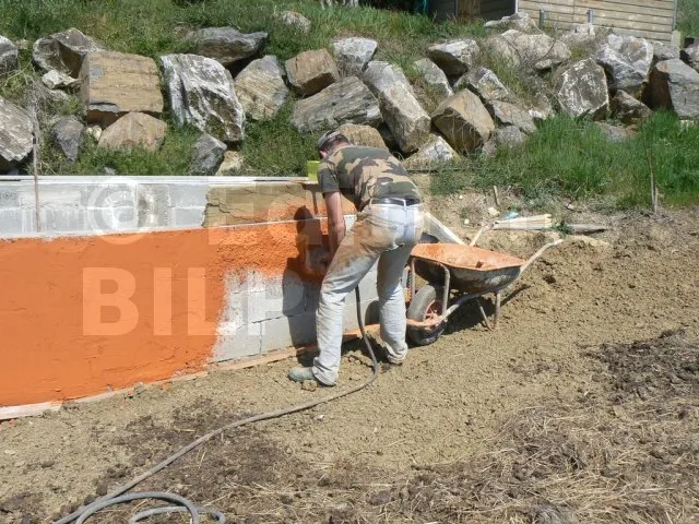 Pour appliquer l’enduit, j’ai utilisé un sablon et un compresseur pour environ 140 euros en location pour deux jours. Le Sablon est une sorte de pistolet surmonté d’un pot que l’on remplit manuellement avec le produit. L’enduit descend par gravité dans une chambre de projection à l’air comprimé.