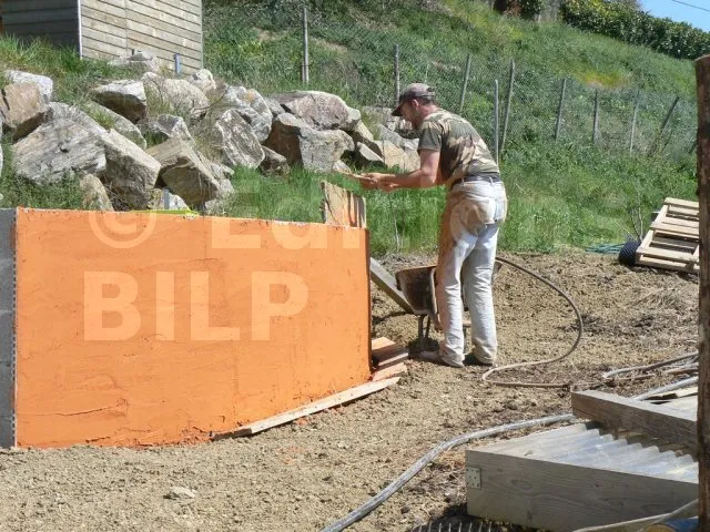Pour réaliser l’enduit, j’ai acheté un produit prêt à l’emploi d’une grande marque. Les sacs de 20 kg sont chers (une dizaine d’euros/sac) mais ce produit a de grandes qualités : son application est facile, le produit colle au support, et la teinte est soutenue et identique d’un sac à l’autre.