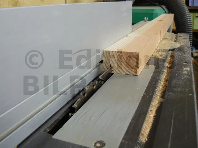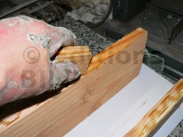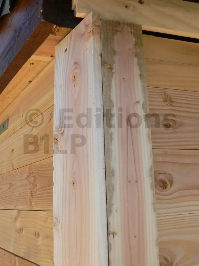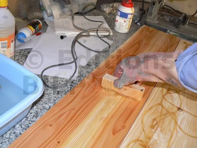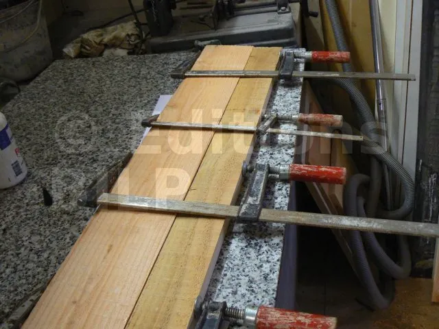 Pour cela, j’ai pris du Douglas mais comme je ne disposais pas d’une largeur et d’une épaisseur suffisantes, j’ai réalisé un assemblage lamellé-collé. Pour la colle, j’ai pris une polyuréthane liquide, idéale pour le collage bois en extérieur. Avant le collage, j’ai usiné les chants avec un profil en denture.