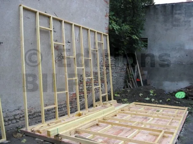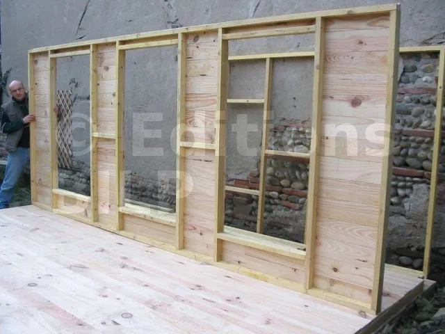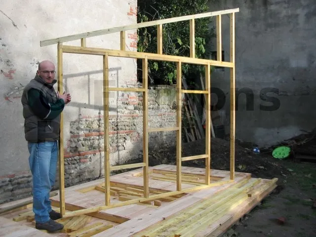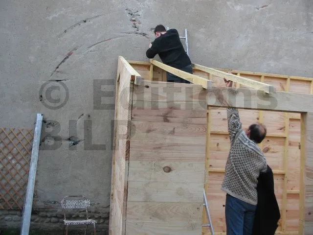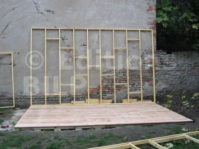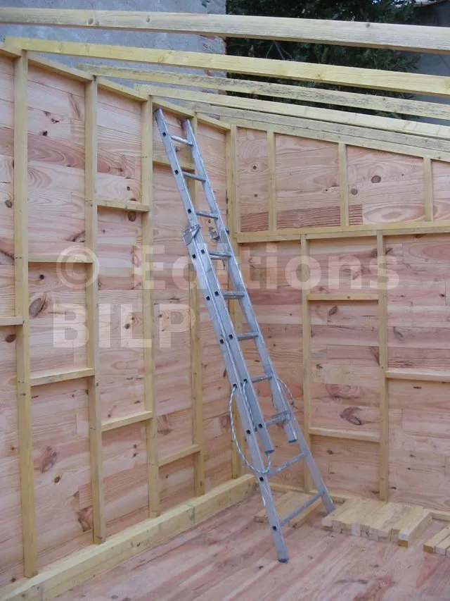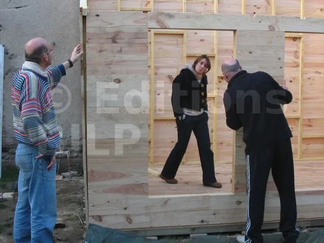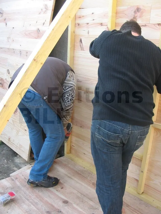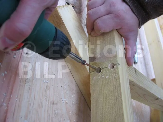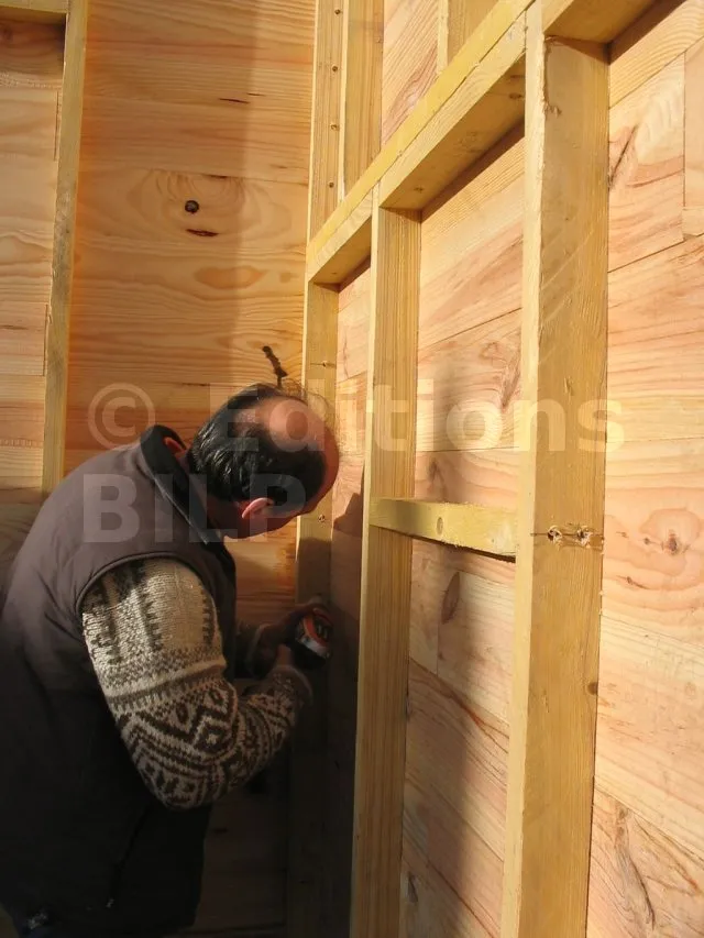 On commence par construire le squelette des murs. L’ossature est composée de montants verticaux espacés d’une cinquantaine de centimètres. On fixe des entretoises entre les montants pour fixer l’écart et pour assurer le contreventement. Une lisse haute et une lisse basse, faites des mêmes lambourdes que les montants, sont fixées aux extrémités.
