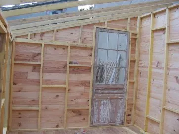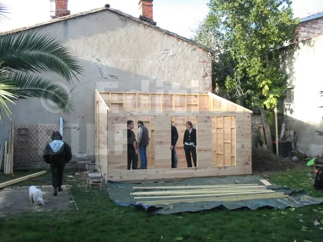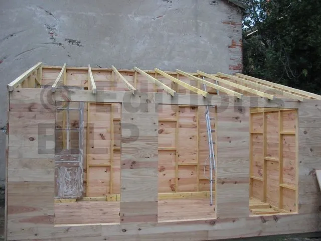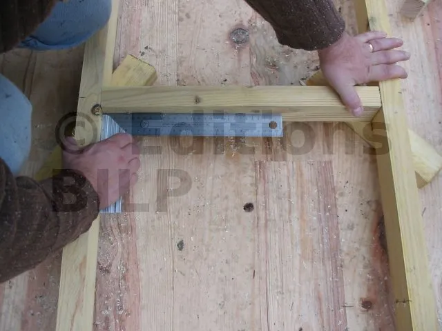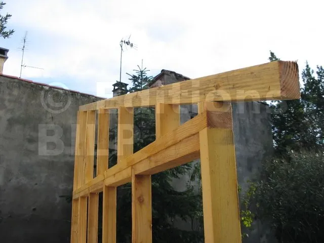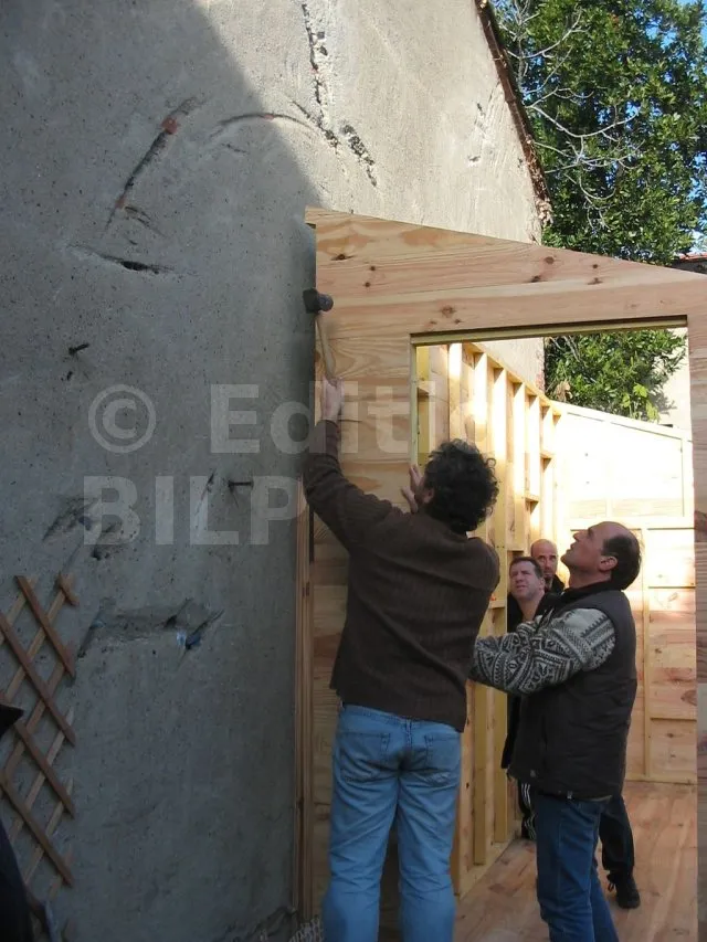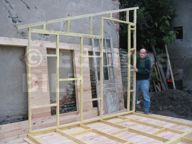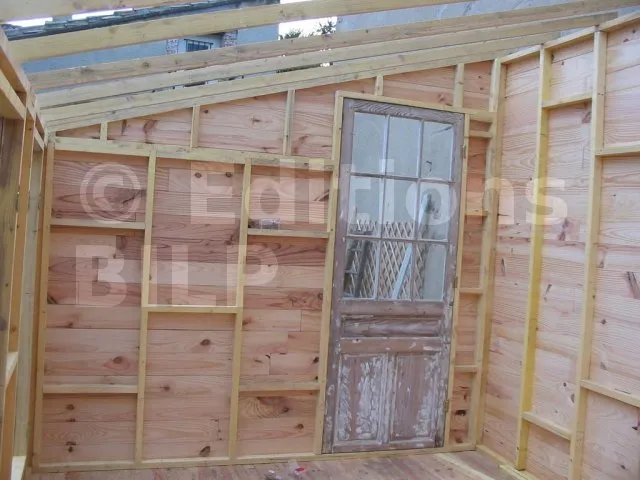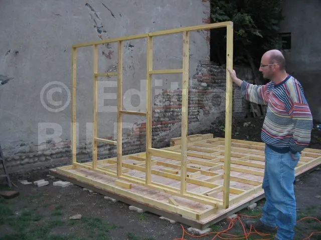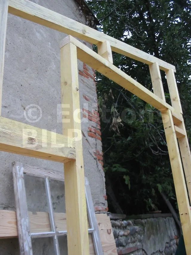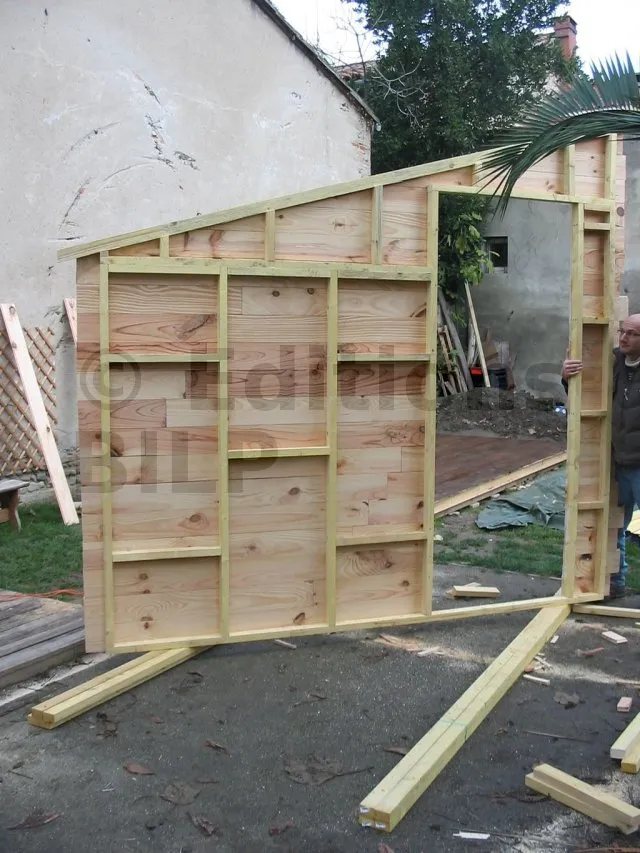 On commence par construire le squelette des murs. L’ossature est composée de montants verticaux espacés d’une cinquantaine de centimètres. On fixe des entretoises entre les montants pour fixer l’écart et pour assurer le contreventement. Une lisse haute et une lisse basse, faites des mêmes lambourdes que les montants, sont fixées aux extrémités.