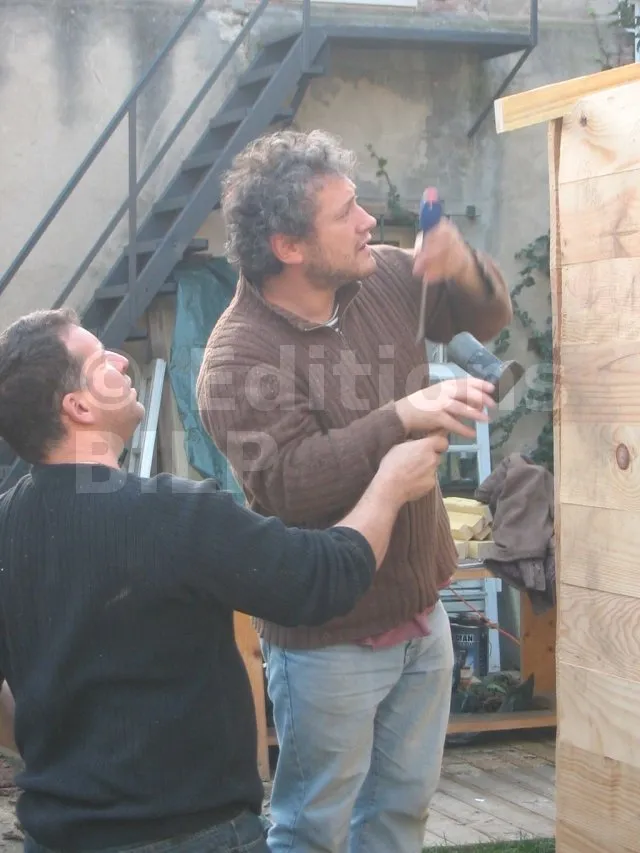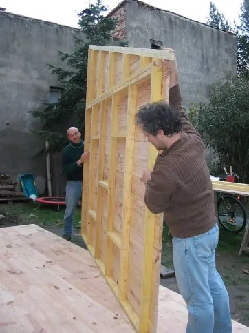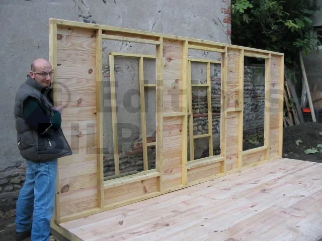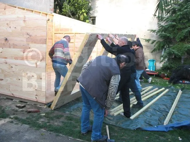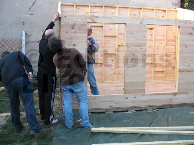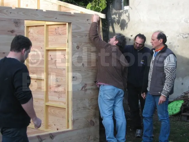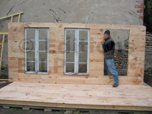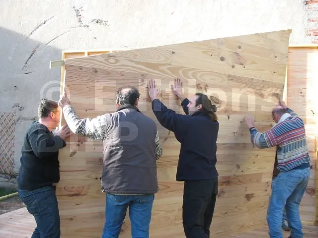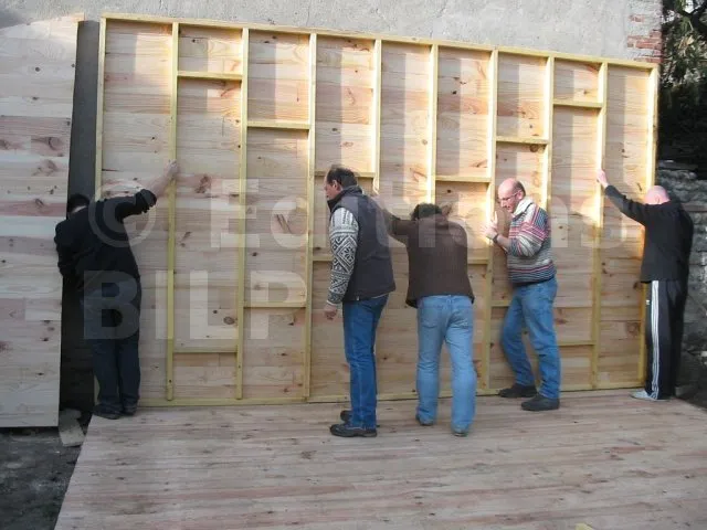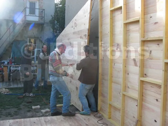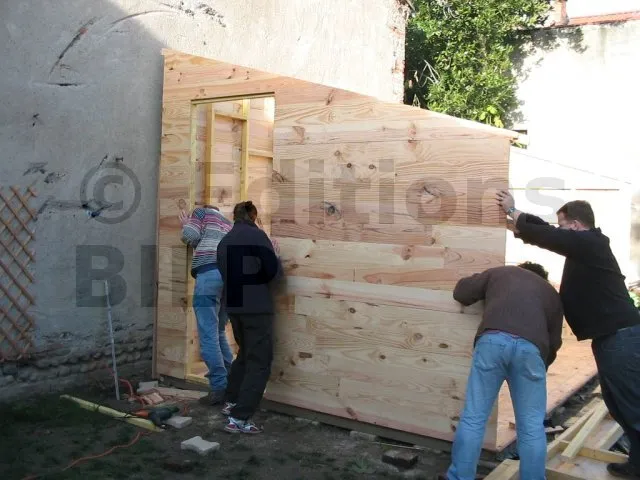 Toutes les parois sont terminées et en attente de montage. Il est temps de les apporter une à une sur la plat-forme et de les fixer. Pour cette étape, on a fait appel à des bons copains, car les parois sont lourdes. C’est pas le moment de se faire un lumbago !
