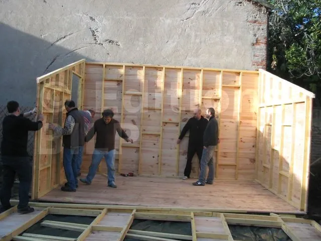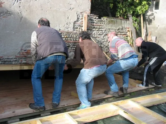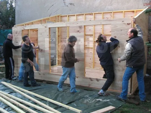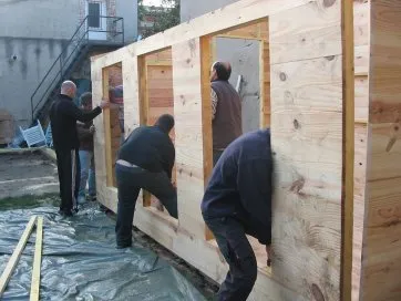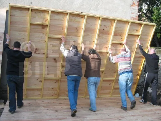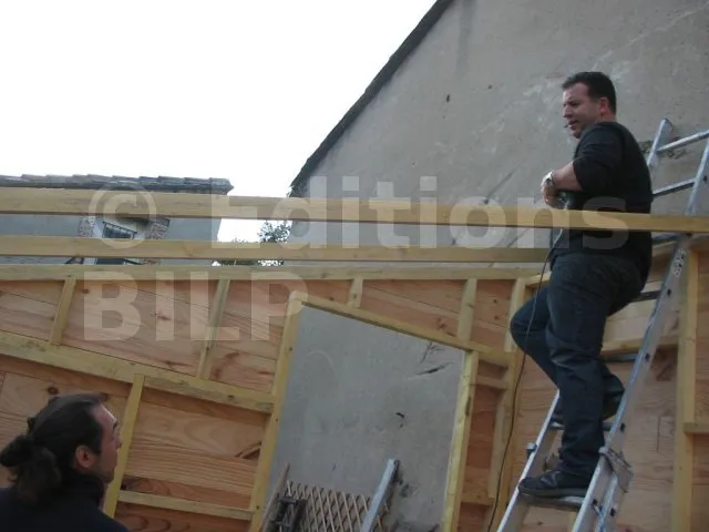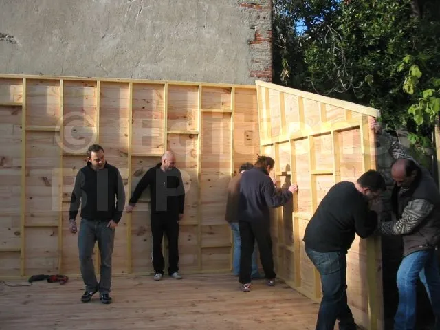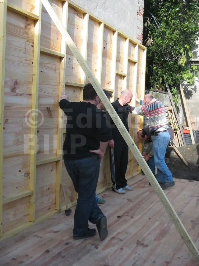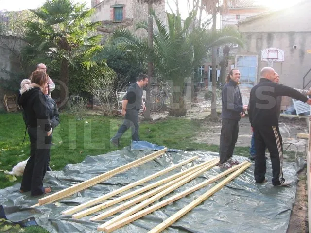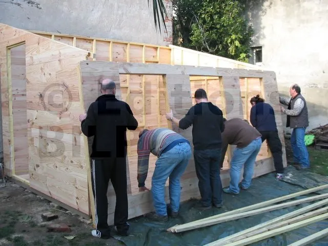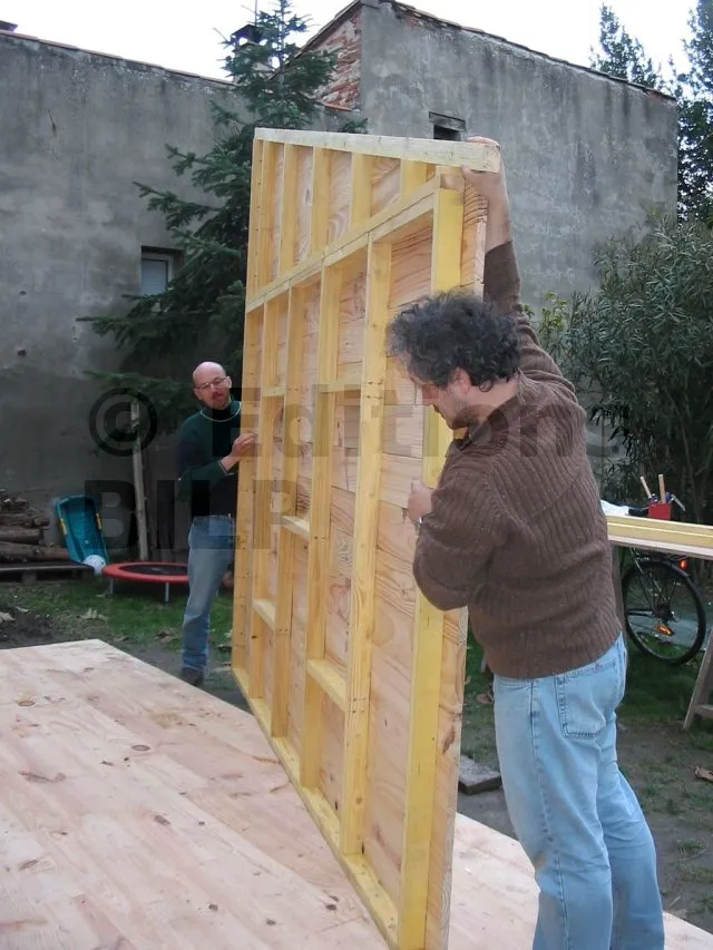 Toutes les parois sont terminées et en attente de montage. Il est temps de les apporter une à une sur la plat-forme et de les fixer. Pour cette étape, on a fait appel à des bons copains, car les parois sont lourdes. C’est pas le moment de se faire un lumbago !
