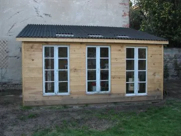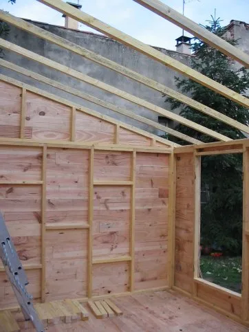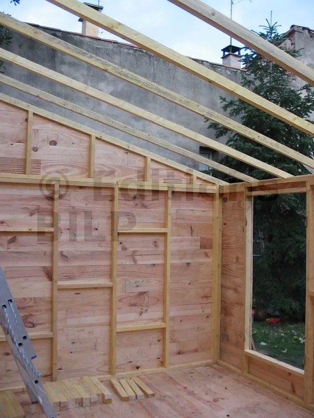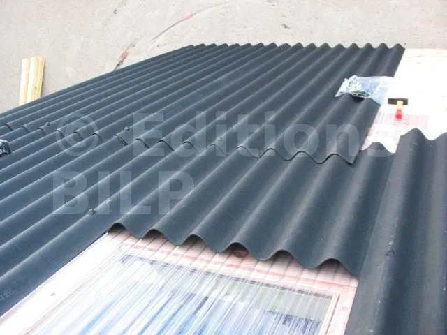 La toiture est réalisée avec de la tôle ondulée en résine, posée sur des solives.