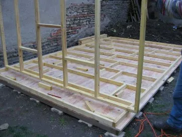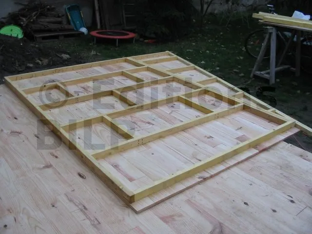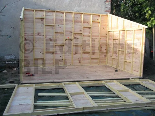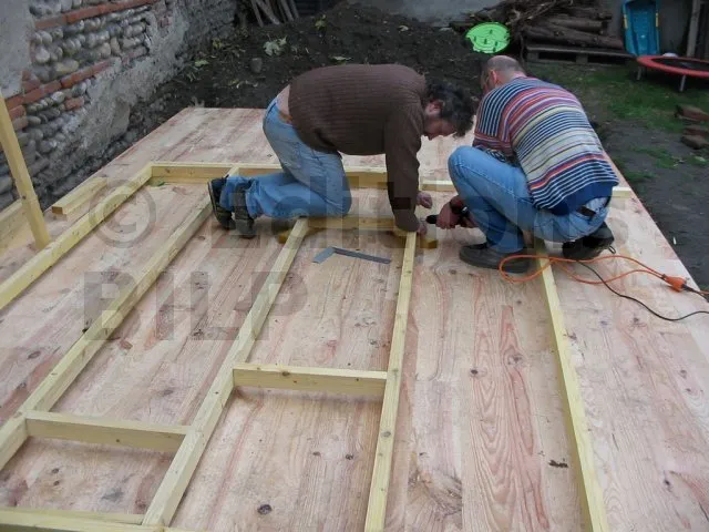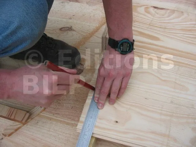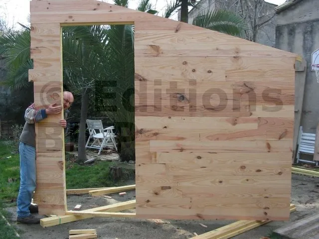 Il est plus rationnel de préparer les murs à plat, à l’horizontal au sol, puis de les monter en un seul bloc. On se sert du plancher déjà réalisé comme base horizontale pour préparer nos ossatures.