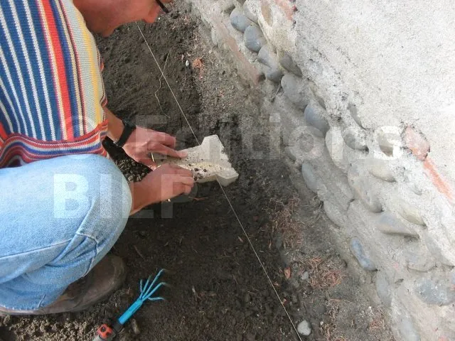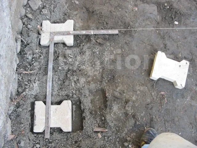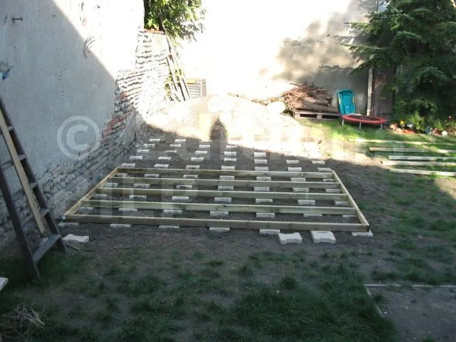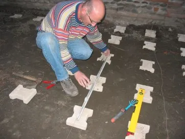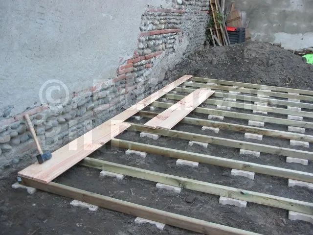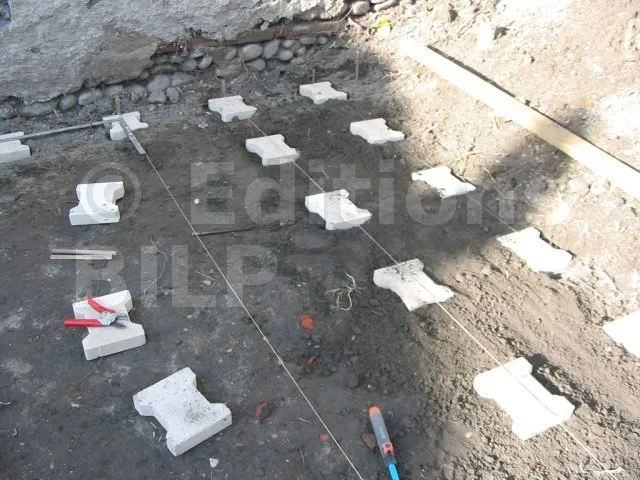 Les pavés sont posés et de niveau. On pose maintenant les lambourdes.