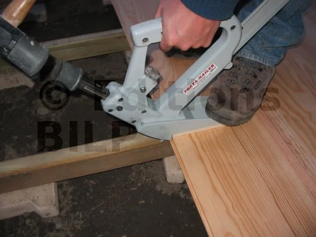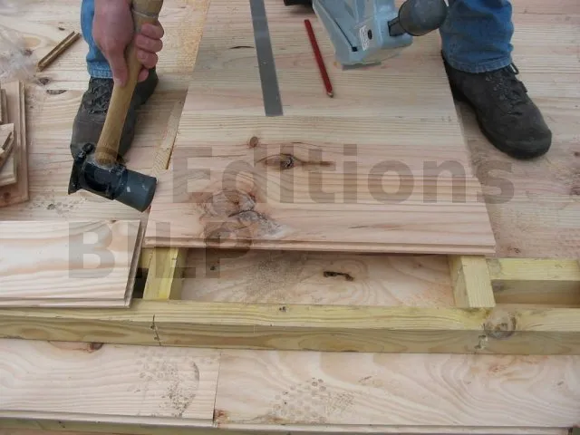 Pour clouer les lames sur les lambourdes, on a eu la chance de disposer d’un cloueur à parquet. C’est un outil fantastique, très efficace qui permet de travailler rapidement, avec précision et sécurité. Évidemment, on peut aussi faire avec un simple marteau ou avec des vis.