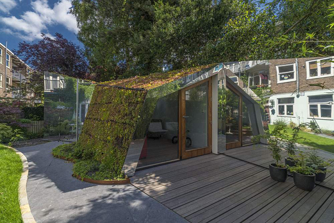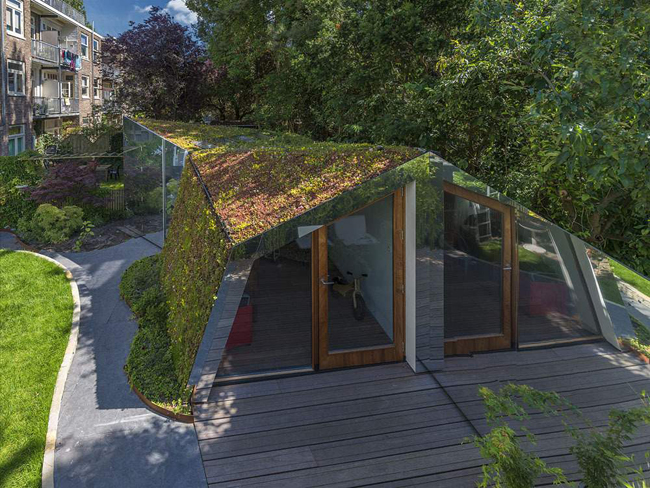 L’idée des architectes de cc-studio est tout simplement une petite cabane de jardin terne et sans vie en un studio qui se fond dans le décor naturel, à savoir un jardin verdoyant. Le but est donc de valoriser cet espace, peu spacieux certes, mais très précieux dans un Amsterdam pris dans l’étau de l’urbanisme. À la place de l’ancienne cabane se trouve aujourd’hui un studio au toit et au mur végétalisé.