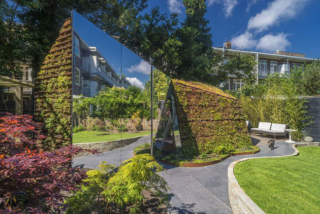 La particularité du projet de cc-studio réside non seulement dans la forme irrégulière du studio, mais également par la présence de deux immenses miroirs qui accentuent l’espace disponible du jardin. La géométrie des miroirs a été spécialement étudiée pour jouer avec les lignes de la perspective et ne pas avoir de surfaces verticales parallèles à la construction. L’un des plans de miroir a par ailleurs été utilisé pour avoir plus de lumière et contrer ainsi l’ombre apportée par les arbres du voisinage.