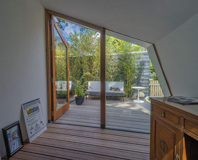 Avec un total seulement 28 m², la construction du studio de jardin n’a pas nécessité de permis de construire, ce qui a considérablement facilité le projet. À l’intérieur, la couleur blanche utilisée pour peindre les murs offre une impression d’espace et permet par ailleurs de mieux diffuser la lumière naturelle qui entre par la porte vitrée et trois ouvertures faites sur le toit. Il faut noter que le studio proprement dit ne fait que 9 m², auxquels s’ajoutent une terrasse de 9 m² et un entrepôt de 11 m².