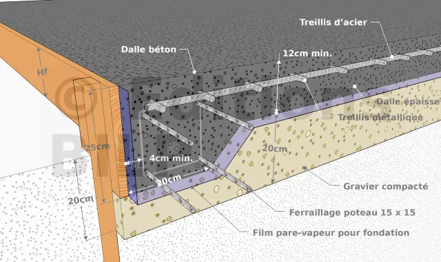 - semelle filante : tout autour et au droit des murs de séparation portants, la semelle filante permet de supporter convenablement la charge ainsi que d’encadrer la future finition du sol intérieur ;